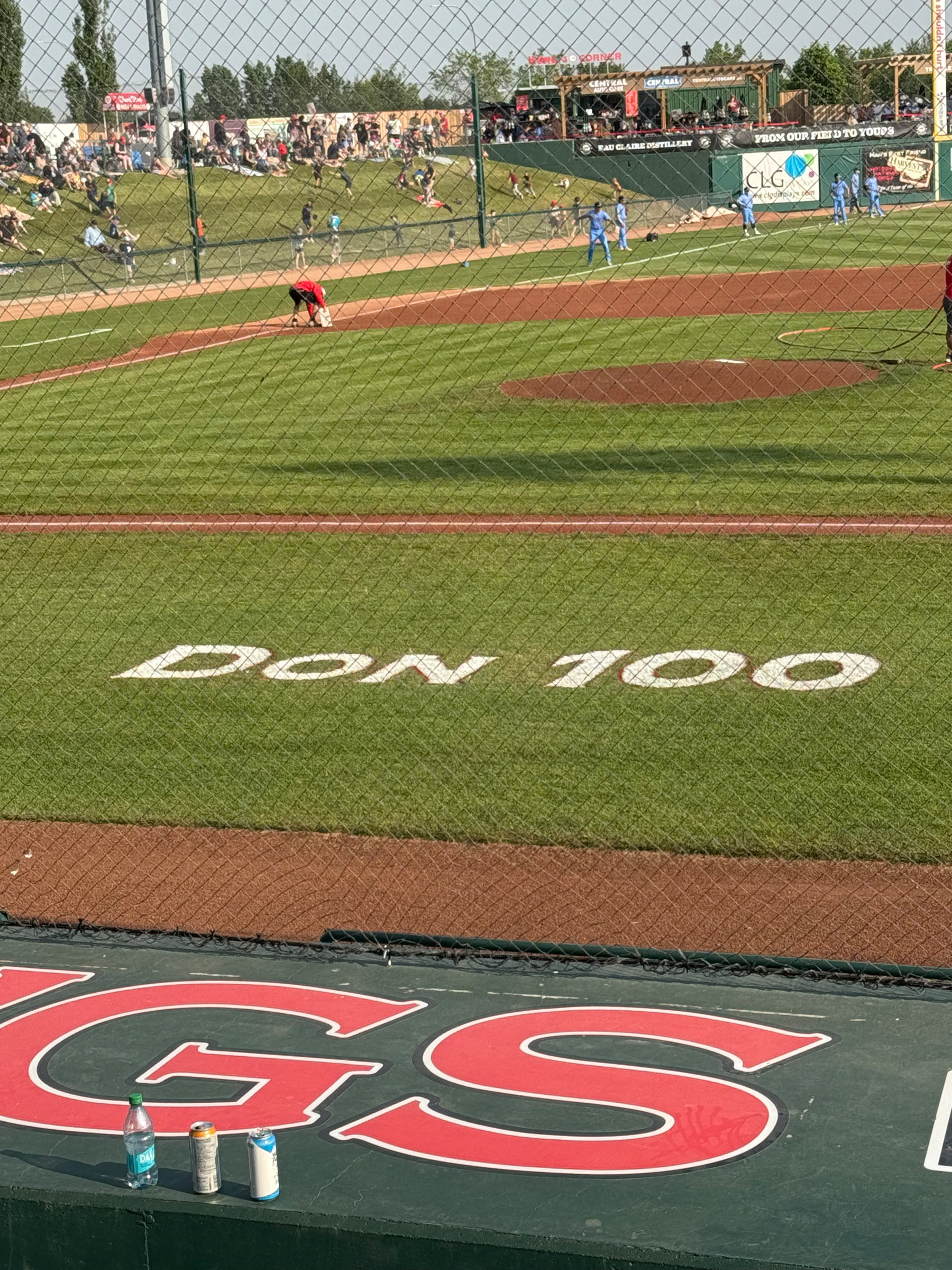 I took a trip out to Okotos, Alberta recently and ended up at a baseball game at Seaman Stadium, home of the Okotos Dawgs. It’s a great spot to watch a game, but what really caught my attention wasn’t the baseball, it was two words painted right on the field: “Don 100.”